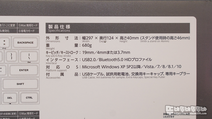 패키지 아래에서는 제품의 키 배열 설명과 스펙 정보 사이즈 - W297 x D124 x H40mm (높이 조절 다리 사용 시 46mm) / 무게 - 680g / 인터페이스 USB 2.0, 블루투스 5.1을 확인할 수 있습니다.