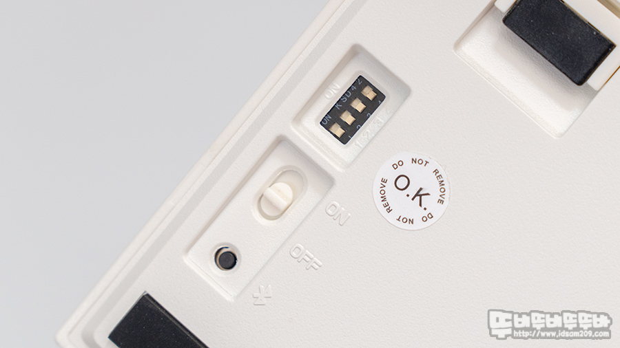 키보드 하판 측면에 위치한 키보드 키 배열을 변경하는 DIP 스위치와 블루투스 On/Off 스위치, 블루투스 페어링 버튼 모습.