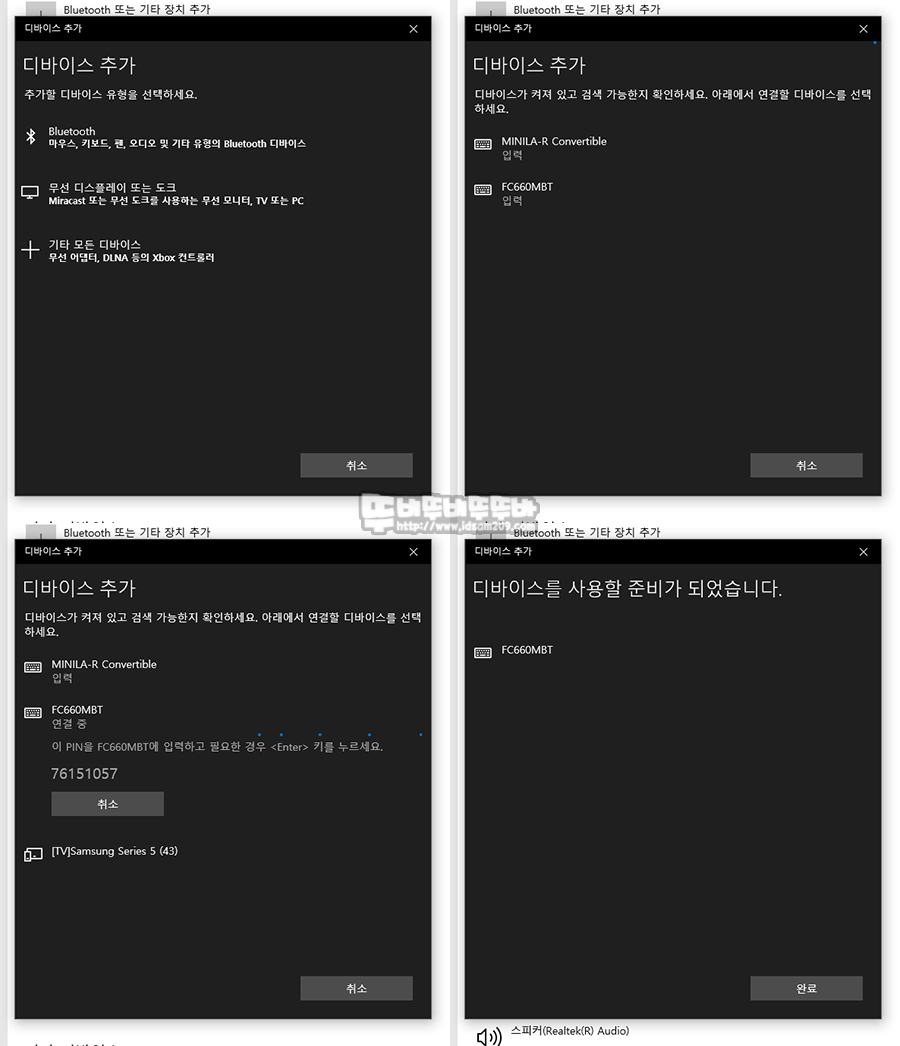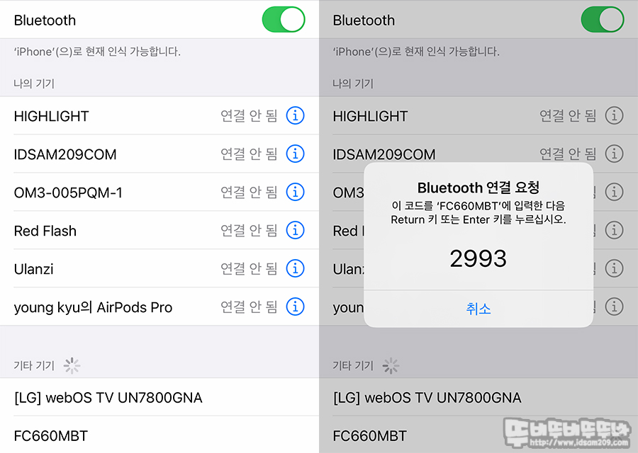 페어링 방식은 Fn+1번을 누르고 키보드를 뒤집어 블루투스 페어링 버튼을 누른 후 스마트 기기 또는 PC의 블루투스 메뉴에서 FC660MBT를 선택하면 됩니다.