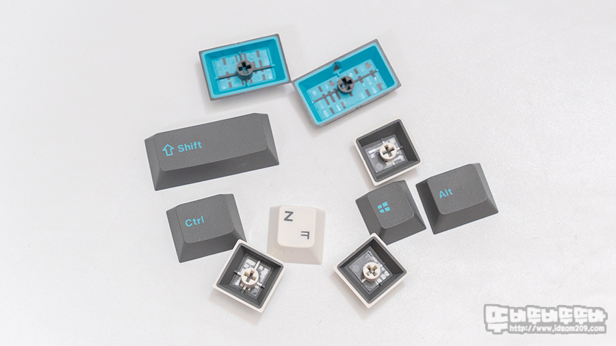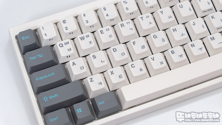 PBT 이중사출로 제작된 키캡은 화이트 베이스에 블랙 각인, 그레이 베이스에 블루 계열의 컬러 각인으로 포인트를 주었으며 사출 제작에 어려운 측각 각인은 실크인쇄로 마무리되었습니다.