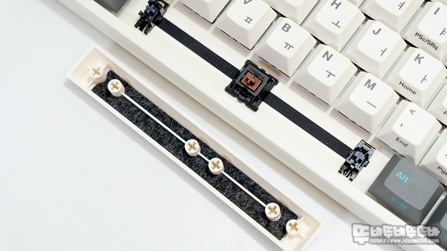 그나마 레오폴드의 경우 실리콘 바를 이용하여 보강판의 타공 부분을 메우고 스페이스 바 키캡 안쪽에 부직포 흡음재를 넣어 소음 면에서 정숙함을 보여주고 있습니다.