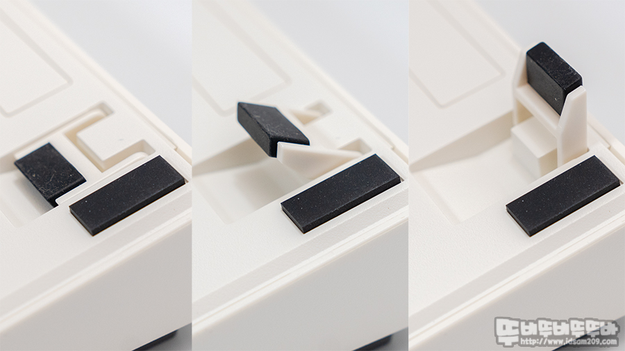 높이 조절 다리에 키보드 사용 시 미끄러짐을 방지하는 두툼한 패드가 부착된 모습.
