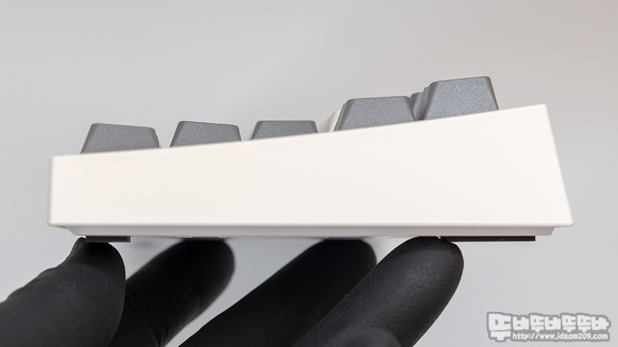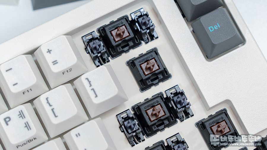 정방향 체리 MX 갈축 스위치와 윤활 처리된 보강판용 체리 방식의 스테빌라이저, 소음을 줄이기 위해 사용된 스페이스 바 보강판 홈을 막은 실리콘 바, 스페이스 바 키캡 안쪽의 부직포 흡음재 등 키보드의 잡소음을 잡기 위해 기존의 기성품에서 볼 수 없었던 다양한 시도를 확인할 수 있었습니다.