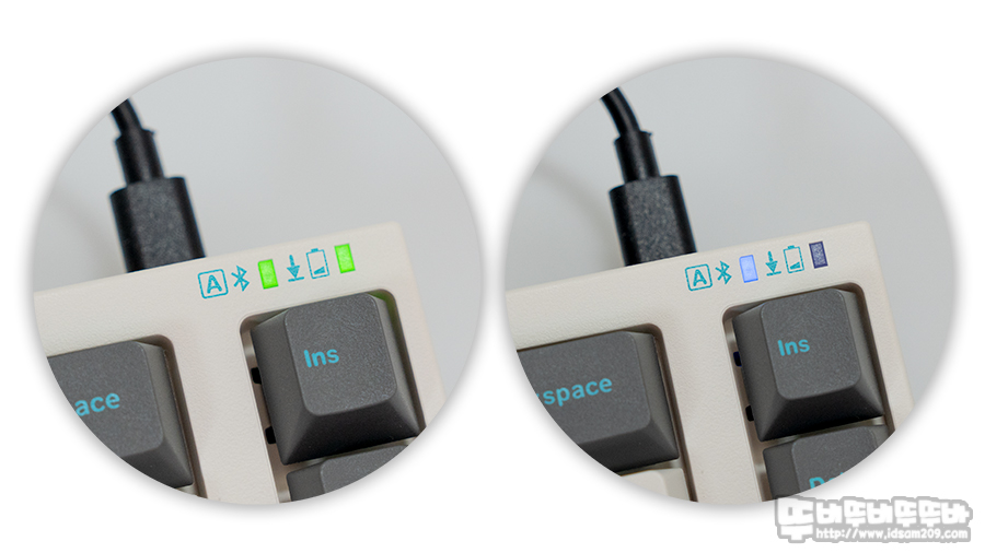 유선일 때 Cap Lock, Scroll Lock LED 인디케이터는 Green 컬러 LED로 표현되며, 블루투스 페어링과 사용은 Blue 컬러 LED로 점멸 및 점등, 그리고 배터리 잔량 표현은 20~30%일 때 Red LED 점멸로 표현됩니다.