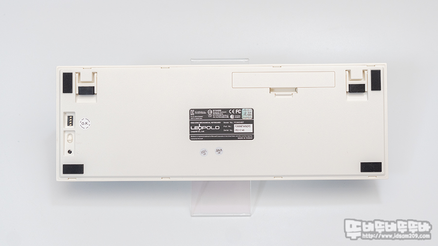 키보드 하판을 살펴보면 위/아래로 미끄럼 방지하는 패드와 건전지 소켓, DIP 스위치, 블루투스 On/Off 스위치, 블루투스 페어링 버튼을 확인할 수 있습니다.