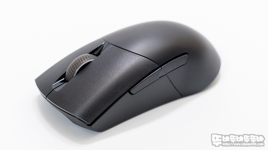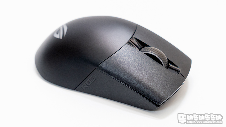 ROG Keris Wireless 마우스는 절개형 버튼 디자인에 PBT 재질을 사용하고 있어 버튼 사용 시 PBT의 뽀송뽀송한 느낌을 느낄 수 있으며 마우스 휠 스크롤과 뒷면에 로고 부분에 LED 효과를 표현하고 있습니다.