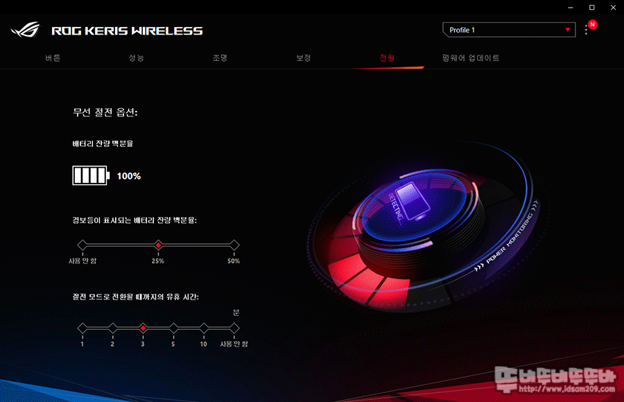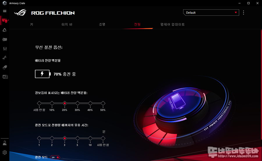 전원 메뉴에서는 배터리 잔량과 절전 옵션, 배터리 잔량 경보표시 %를 변경할 수 있습니다.
