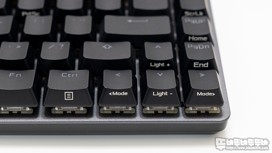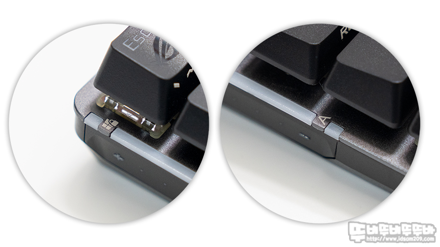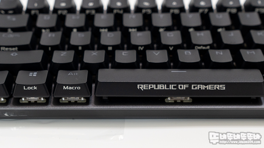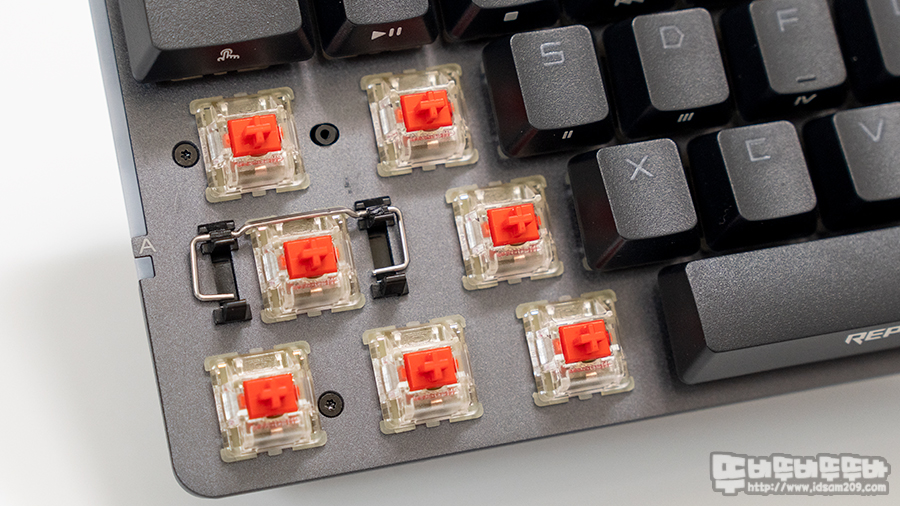 비키 타입의 키보드 상판에는 역방향으로 배치된 마제 방식의 스테빌라이저가 사용되었는데 체리 MX 스위치 경사 부분에 돌출된 스테빌라이저가 있어 스위치 및 키캡에 간섭을 일으키지 않으며 LED 빛 투과되는 PBT 이중사출 키캡을 사용한 게 특징입니다.