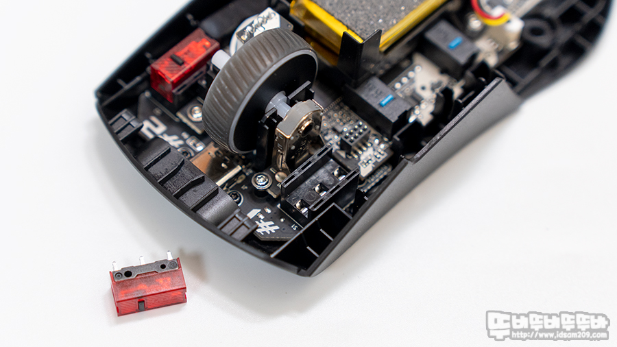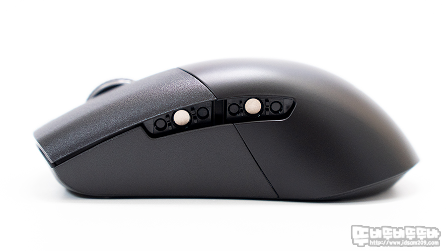 마우스 시 안정된 무게 벨런스를 느낄 수 있게 중앙부에 배치된 배터리 모습.
