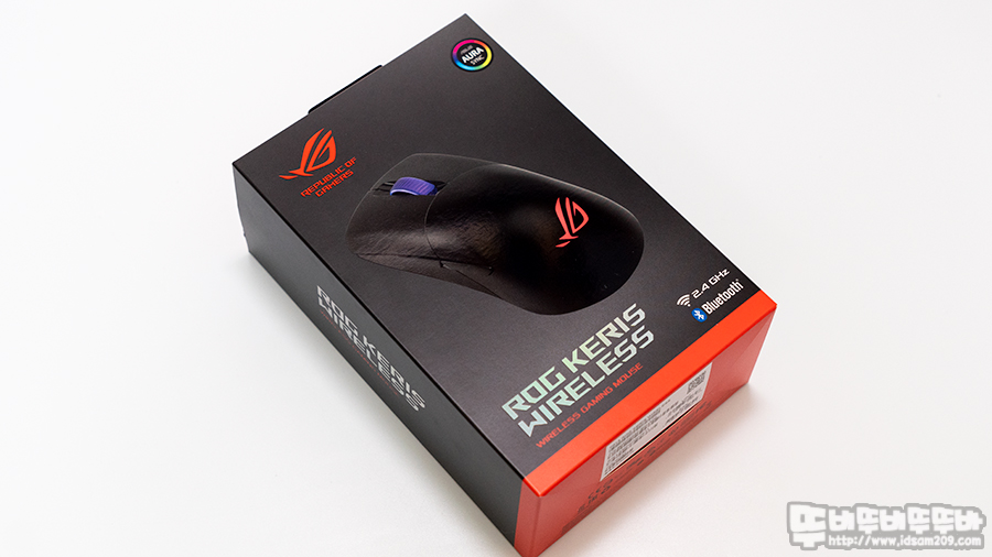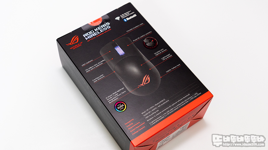 ROG Keris Wireless 패키지 전면에는 RF 2.4GHz / 블루투스 무선을 지원하는 내용과 뒷면에 제품의 특징을 표현하고 있습니다.