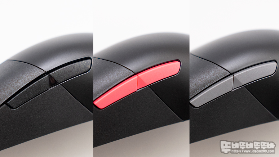 3가지 방식(유선/2.4GHz/Bluetooth)의 연결을 지원하는 ROG Keris Wireless는 메인 버튼을 유저가 교체할 수 있는 핫스왑 소켓을 사용과 PBT 재질의 플라스틱이 사용된 버튼과 사이드 버튼의 커버 교체가 가능한 매우 실속 있는 마우스인데요.