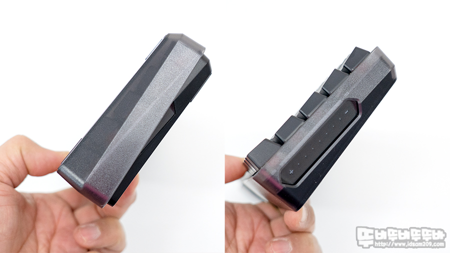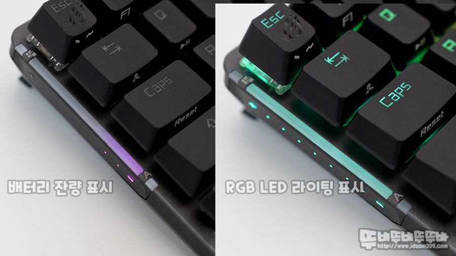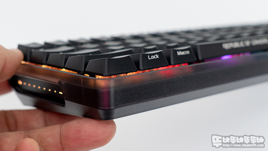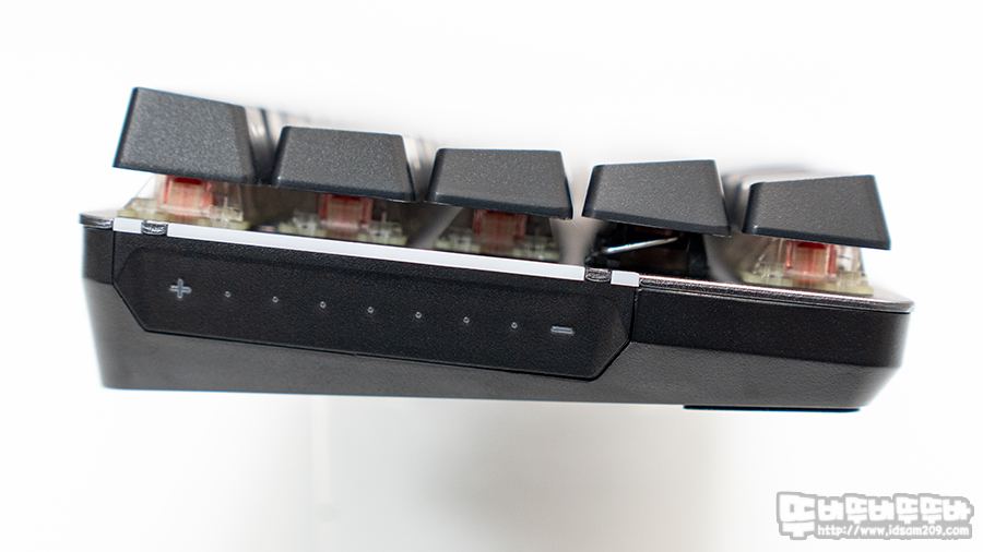 사이드 바 부분 상단에 LED 인디케이터는 Win 키 잠금, Caps Lock 사용 시 화이트 LED로 점등으로 표현되며 중간 부분은 배터리 잔량 표현 또는 소프트웨어 선택으로 LED 이펙트로 표현으로 선택할 수 있습니다.