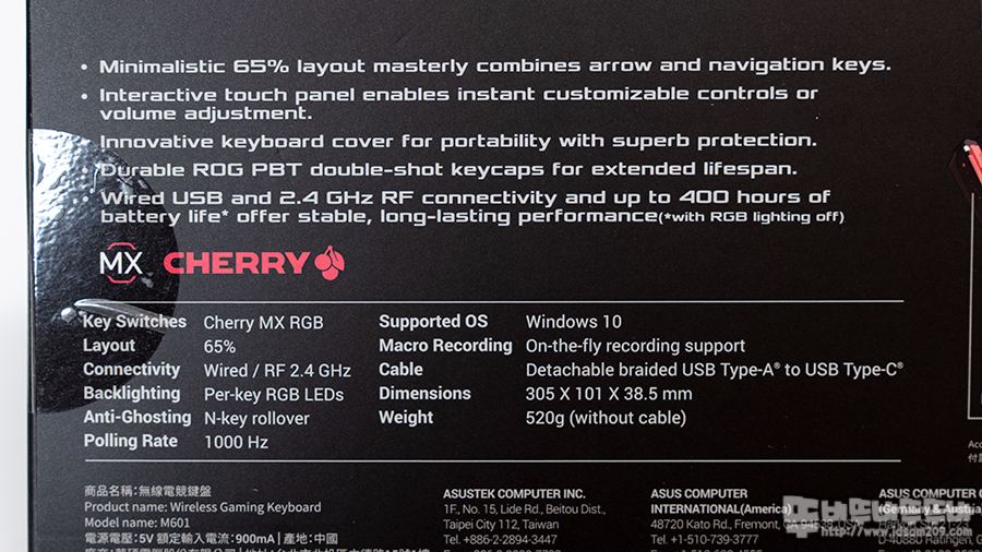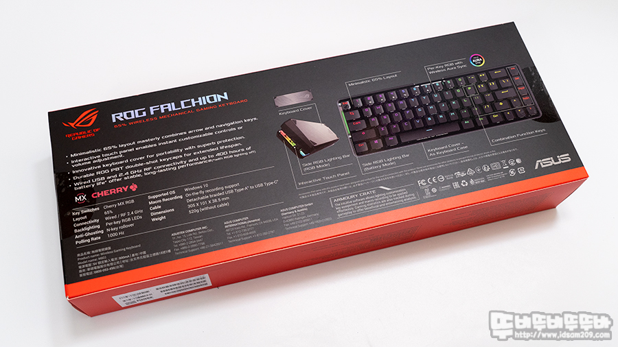 65% 배열의 ROG FALCHION은 유선과 RF 2.4GHz 무선으로 사용하며 305 X 101 X 38.5mm 크기와 520g 무게로 휴대가 가능한 폼펙터 제품입니다
