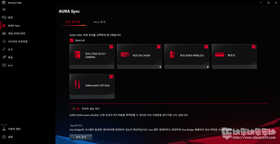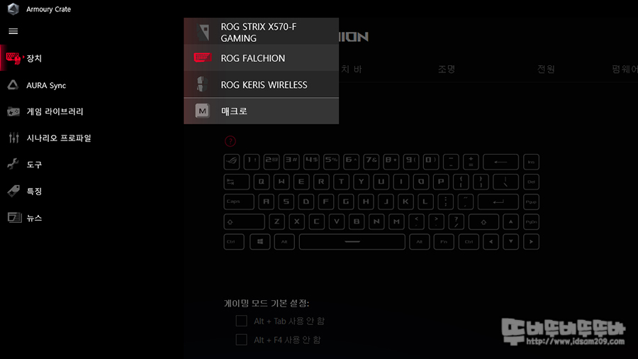 Armoury Crate의 AURA Sync를 사용하면 장치 동기화가 가능한 제품에 ROG FALCHION과 ROG KERIS가 포함된 것을 확인할 수 있는데요.