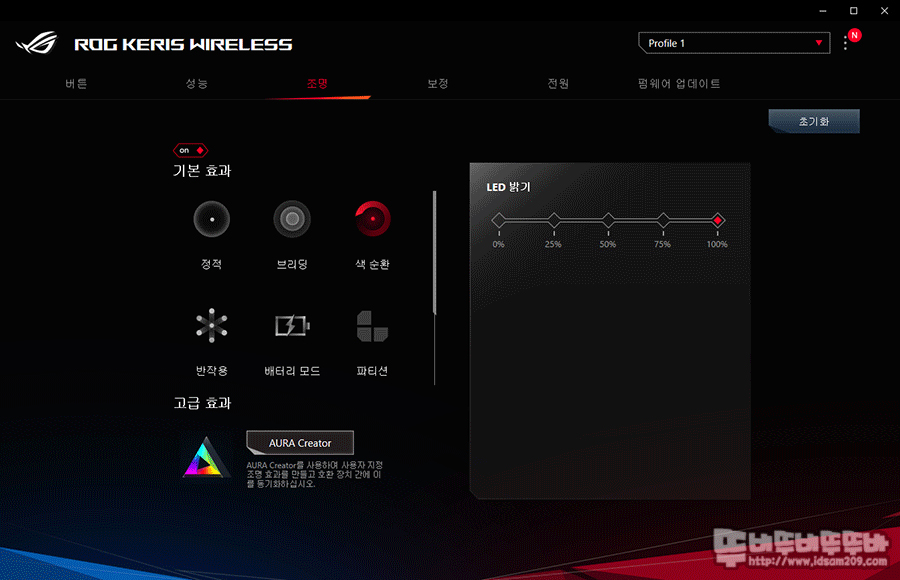조명 메뉴에서는 마우스 전용 LED 효과를 선택할 수 있으며 이 중에서 휠 스크롤과 로고 부분의 LED 효과를 다르게 표현할 수 있는 파티션 모드는 전체 메뉴로 빠져나오는 기능이 없어 Armoury Crate 종료하고 다시 실행해야 하는 번거로움이 있었습니다.