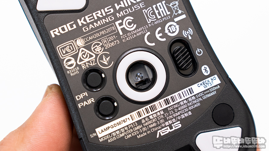 ROG KERIS 무선 마우스 유선 / RF 무선 / 블루투스 무선으로 사용이 가능하며 메인 스위치를 핫스왑 소켓을 사용하여 메인 스위치를 자가 교체할 수 있는 게 특징입니다.