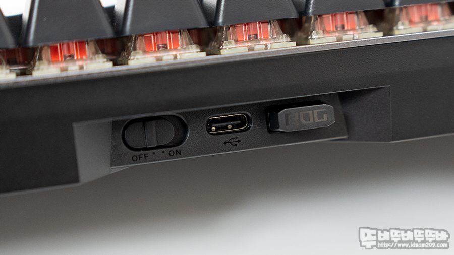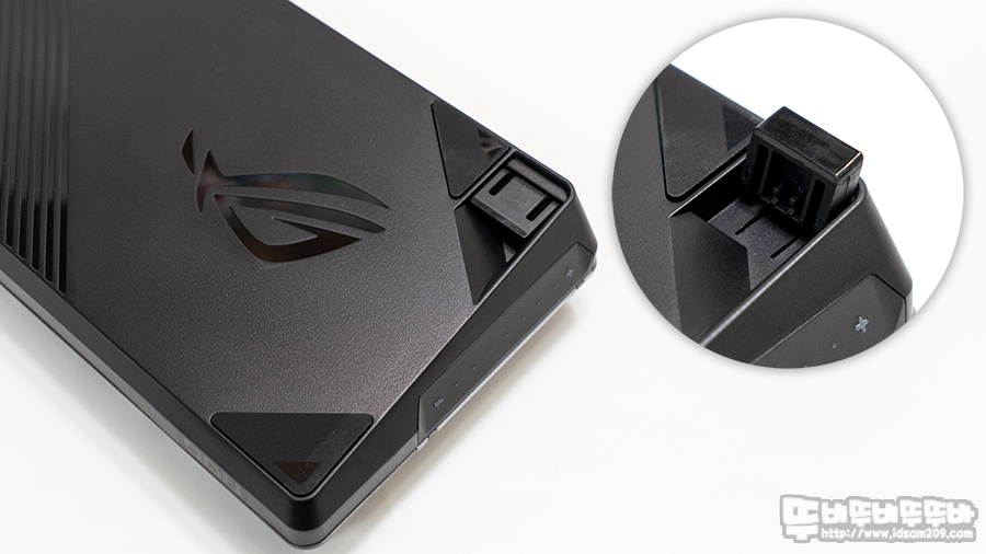 ASUS ROG FALCHION 무선 키보드 상단부의 전원 스위치와 USB-C 단자 그리고 자석으로 수납되는 RF 리시버 모습.