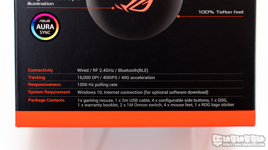 RF 2.4GHz, 블루투스, USB 유선 연결 / PAW 3335 센서 / 최대 16,000DPI / USB 폴링 레이트 1000HZ / L, R 스위치 ROG 7천 만회 수명 / AURA SYNC 동기화 / 500mAh 배터리 내장 / LED Off 시 약 78시간, LED On 시 약 52시간 사용 / 118 (L) x62 (w) x39 (H) mm / 79g의 스펙 정보를 확인할 수 있습니다.