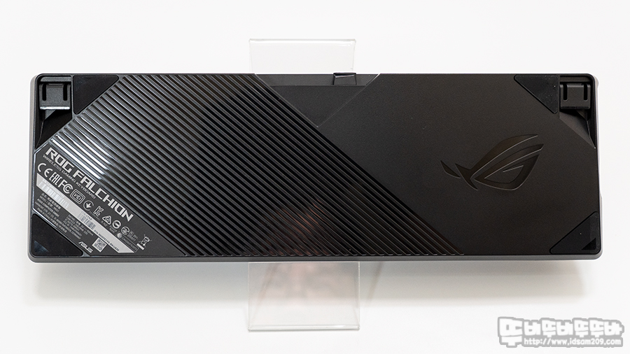 ROG FALCHION의 바닥 면은 빗살무늬와 ROG 로고가 새겨진 디자인에 키보드 상단과 하단에 미끄럼 방지 패드가 부착되어있으며 높이 조절 다리에서 슬림하지만 강력한 미끄럼 방지 패드가 부착되어있고요.
