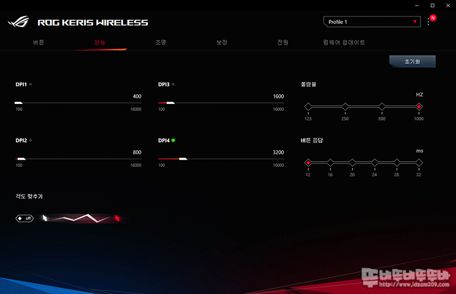 버튼 메뉴에서는 마우스 버튼의 기능 설정, 성능 메뉴에서는 DPI 설정 및 USB 폴링 레이트, 버튼 응답 속도, 앵글 스냅 설정을 지원합니다.