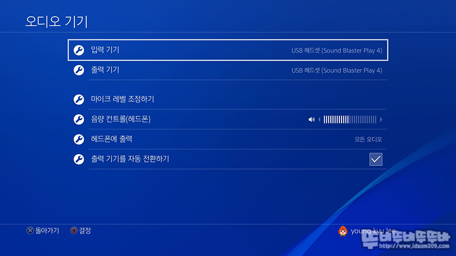 PS4와 닌텐도 스위치에서 사용 가능한 MODE 1을 선택 시 PS4의 사운드 마이크 설정에서는 Sound Blaster PLAY 4로 인식되는 것을 확인할 수 있고요.