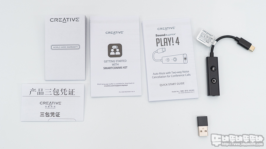 제품의 구성으로는 제품 사용 설명서, 소프트웨어 사용 설명서, 워런티 가이드, Sound Blaster Play 4 본체 그리고 USB-C to USB-A 변환 젠더로 구성되어있습니다.