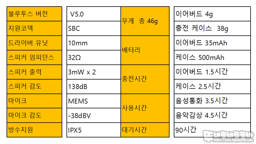 블루투스 버전 5.0/ SBC 코덱 지원 / 10mm 드라이버 유닛 사용/ MEMS 마이크 사용 / IPX5 생활방수 지원 / 배터리 용량 : 이어버드 35mAh, 충전 케이스 500mAh / 사용 시간 : 음악 감상 시 약 4.5시간, 충전 케이스를 더해 최대 27시간 사용 / 터치 방식의 컨트롤로 스마트 기기 제어가 가능합니다.