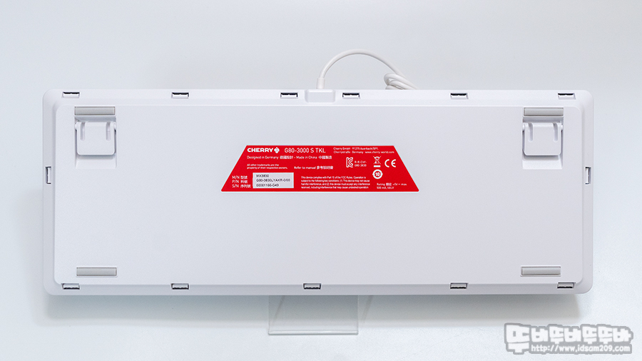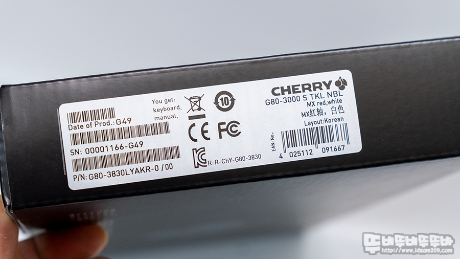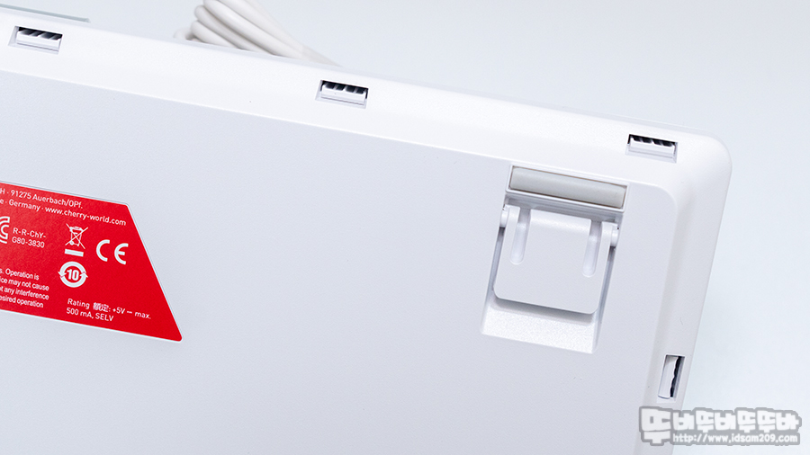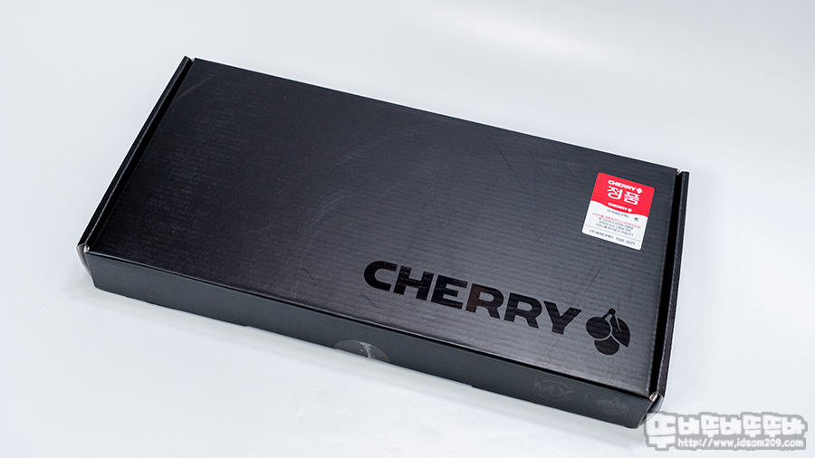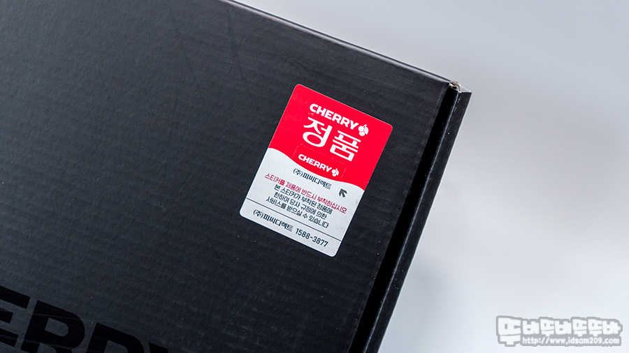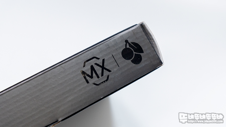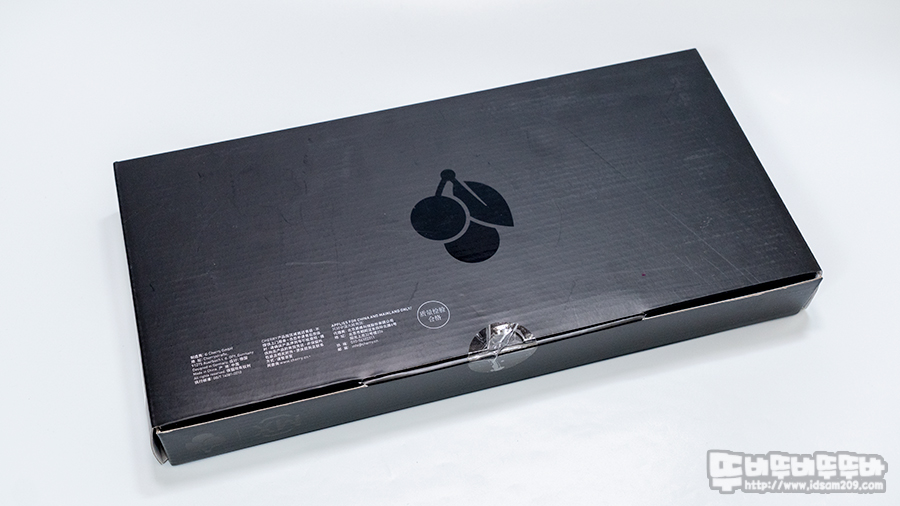 제품의 스펙을 확인할 수 있는 건 측면의 라벨 스티커의 체리 적축 MX 스위치, 화이트 하우징, 한국 레이아웃 표시로 한글 각인 키캡이 사용된 제품임을 확인할 수 있습니다.