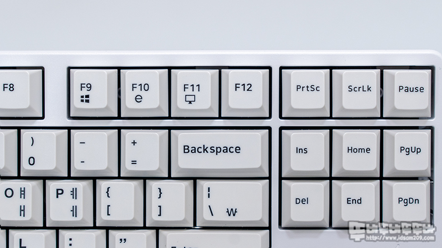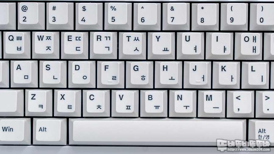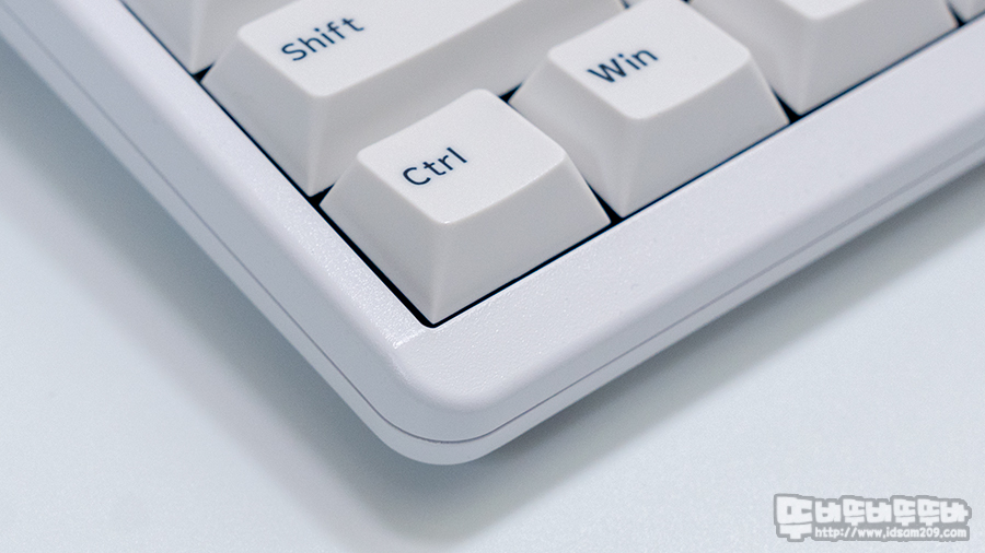 간결하게 각인된 블랙 컬러의 이색 사출 각인은 화이트 베이스에 잘 어울리는 느낌이며 우리가 흔히 알고 있는 PBT의 까실한 표면 느낌이 아닌 ABS와 같은 매끈한 표면 느낌을 주기에 이게 PBT야? ABS야? 하는 헷갈림을 주기도 합니다.