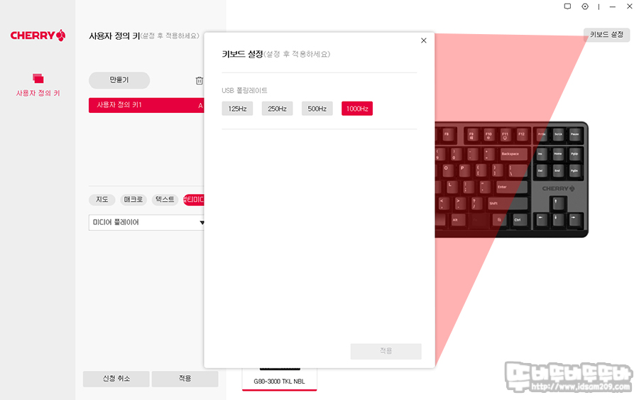 우측 상단의 키보드 설정 메뉴에서 USB 폴링 레이트 변경이 가능하고요.