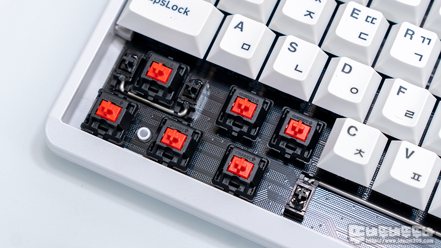 체리 MX 적축 스위치 고유의 리니어 느낌과 보강판이 없는 PCB 탄성이 느껴지는 부드러움 타건감, 랜덤하게 들리는 스프링 소리, 기본 윤활 처리되어 정숙한 스태빌라이저 등 기성품의 특징과 체리 G80-3000의 장점이 공전하는고 있는데요.