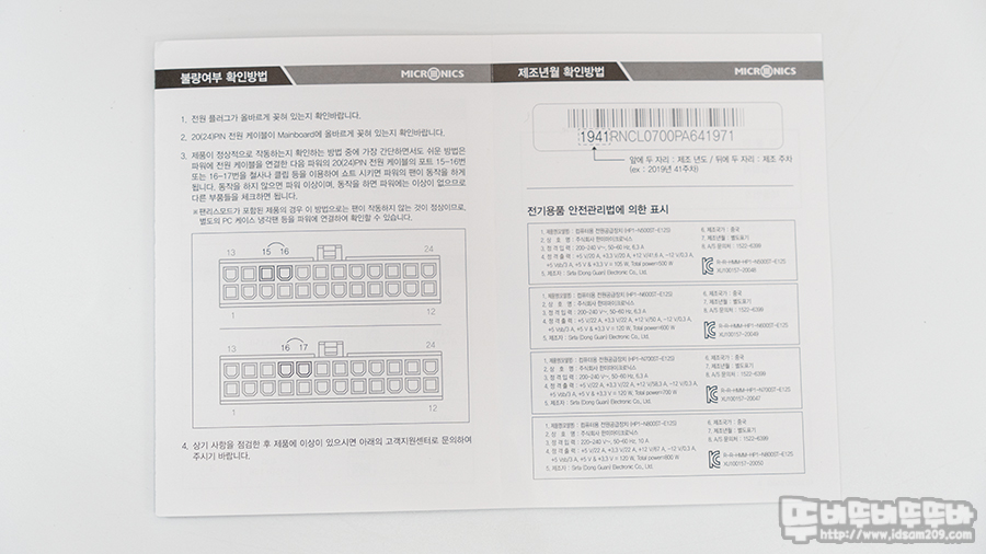 제품의 구성으로는 파워서플라이, 220V 전원 코드, 케이스 샤시 고정용 6각 나사, 사용 설명서로 구성되어 있습니다.