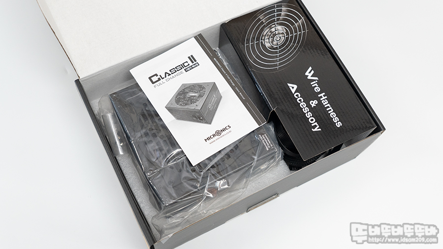 패키지 개봉 시 발포 스펀지에 담겨있는 파워 서플라이와 종이 커버로 분리하여 보관된 케이블을 마주하게 됩니다.