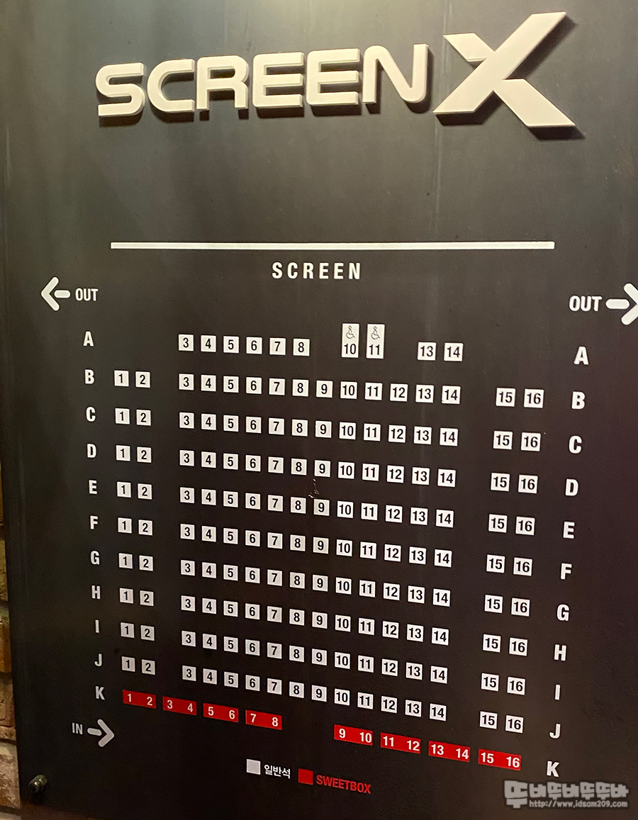 좌석 간의 간격은 편안한 편이며 좌석배치도를 보시면 알겠지만 중앙의 긴 좌서 양쪽 사이드의 두 좌석은 정면 기준 안쪽으로 약 40도? 정도 틀어져 있어 스크린 코너에서 보긴 하지만 틀어진 좌석 덕분에 보는데 불편함은 없는 편입니다.