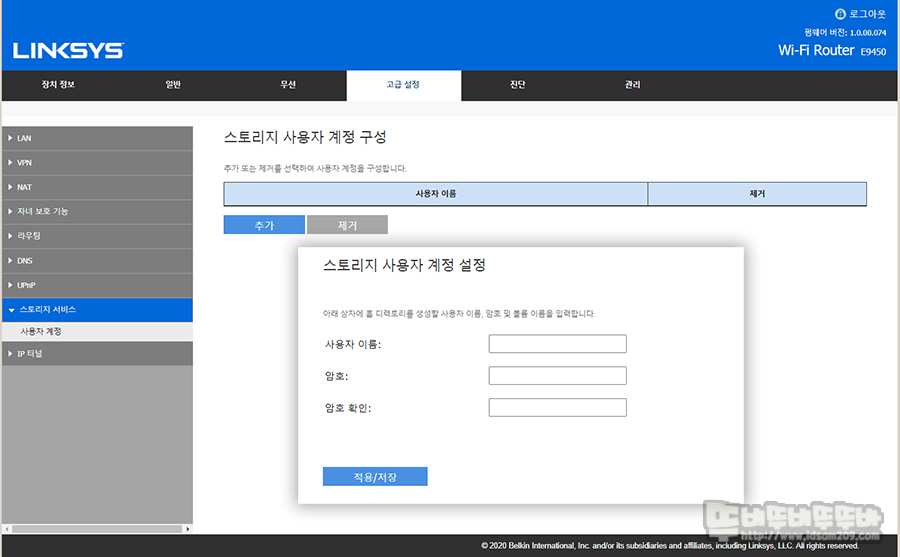링크시스 E9450의 관리자 메뉴입니다.