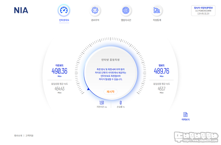 필자는 LG U+ 기가슬림 500Mbps 속도 서비스를 사용하고 있으며 유선으로 속도 측정 시 490Mbps 다운로드 속도와 489Mbps의 업로드 속도로 서비스 상품의 평균속도 이상의 속도를 보여주고 있습니다.
