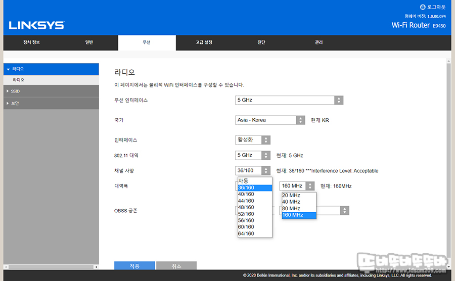 2.4GHz, 5GHz 무선 사용 시 채널 간섭이 있을 때 변경할 수 있는 채널과 대역폭 변경이 가능하며