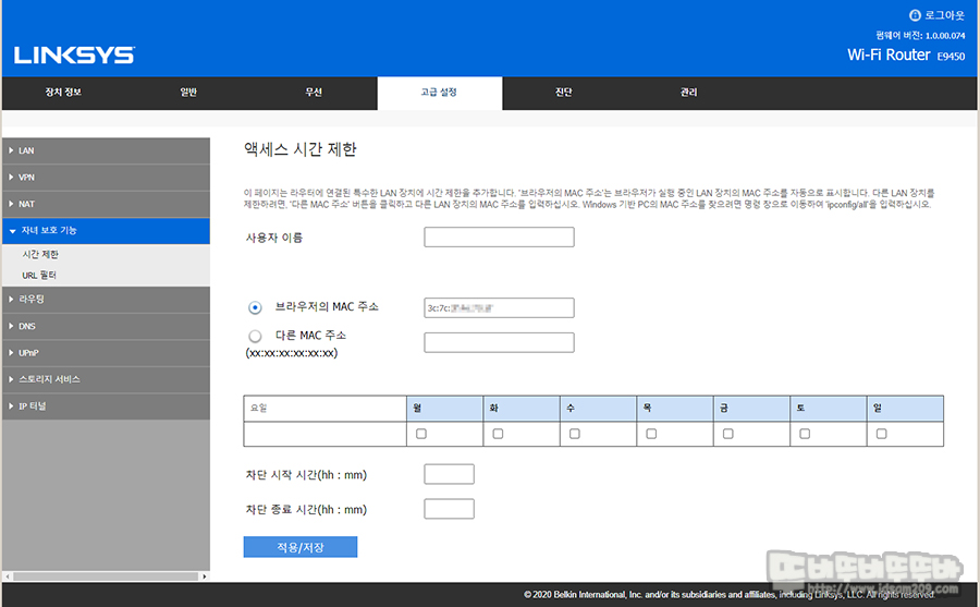 장치 정보의 ARP 기기 접속 정보를 통해 확인한 MAC 어드레스를 이용하여 자녀 보호 기능에 시간제한 메뉴의 추가 버튼을 이용하여 1주일 중 특정일 또는 전체 선택하여 사용을 제한하게 되는데