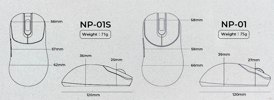 마우스 길이는 같지만, 좌우 폭과 높이가 살짝 높아져 약 75g의 무게감을 보여주는 제품입니다.