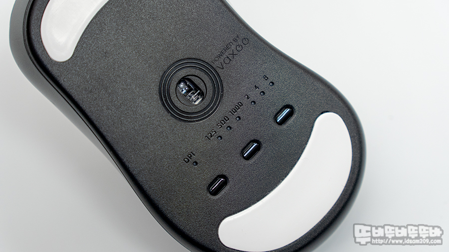 바닥면의 피트는 위/아래부분에 넓은 피트가 적용되어있으며, 아래부분에 DPI / USB 폴링 레이트 / 버튼 반응 속도를 조절할 수 있는 버튼이 위치하고 있는데요.