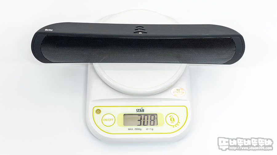 브리츠 BE-M150 PLUS 스테레오 블루투스 스피커는 약 308g 무게와 280 x 60 x 45mm 크기로 휴대성이 좋은 편입니다.