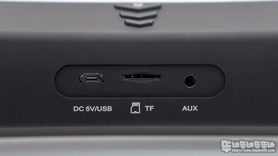 스피커 상단에 위치한 전원 On/Off, 재생/일시 정지, 전화 받기, 끊기 기능을 하는 멀티펑션 버튼과 볼륨 및 트랙 이동을 담당하는 버튼으로 구성된 3 버튼 컨트롤러로 구성과 스피커 뒷면에는 MicroUSB 충전 단자와 TF Card 소켓, AUX 연결 단자 모습을 확인할 수 있습니다.