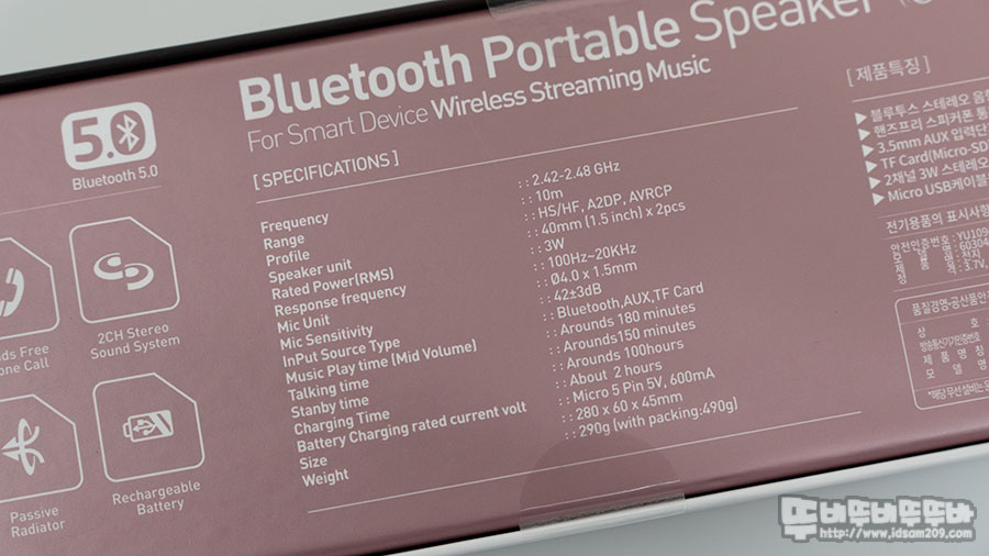 블루투스 버전 5.0 / 드라이버 유닛 40mm X2, 패시브 라디에이터 X2 / 출력 3W / 배터리 600mAh / 충전 시간 약 2시간 / 재생 시간 볼륨 50% 기준 약 3시간 / 핸즈프리 지원 / 음성안내 지원 / Aux 및 TF card 지원 / 크기 280 x 60 x 45mm / 무게 290g 내용 그리고 간단한 제품의 특징이 인쇄되어있습니다.