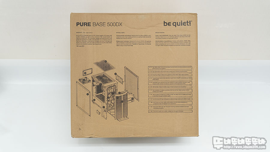 be quiet PURE BASE 500DX 케이스의 앞/뒷면에는 제품의 아웃라인 이미지와 내부 구조에 대한 자세한 내용을 이미지로 설명하고 있으며 측면에는 제품의 스펙 정보와 컬러 정보를 확인할 수 있습니다.