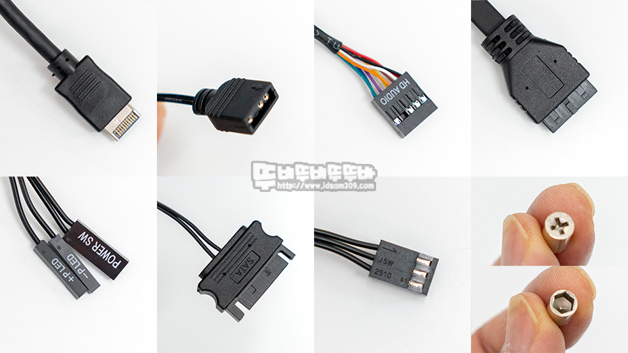be quiet PURE BASE 500DX 케이스에는 메인보드를 스탠드오프를 분리/장착할 수 있는 스탠드오프 전용 툴과 HDD 장착 전용 나사, 육각 헤드 나사(파워/VGA 장착용), 원형 접시 헤드 나사(메인보드/SSD 장착용), 여분의 케이블 타이를 제공하여 기본적인 조립을 지원하며 I/O 포트 연결 커넥트 구성은 다음과 같습니다.