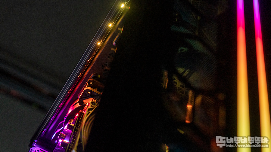 눈으로 보이지 않는 상단 샤시 안쪽에 ARGB LED 바가 기본으로 내장되어있어 ARGB LED 효과가 없는 쿨러를 사용하는 케이스지만 ARGB LED 바 덕분에 분위기 있는 연출이 가능하네요.