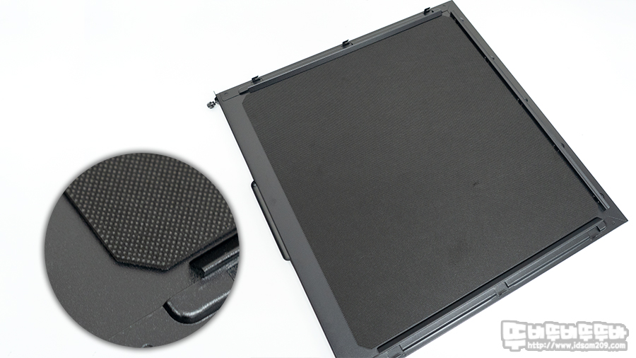 바닥면에는 앞쪽에서부터 슬라이딩 방식으로 장착하는 먼지 필터가 사용되었으며 이 또한 플라스틱 가이드에 필터가 부착되어 고급스러운 느낌을 주며 먼지 필터를 제거하면 HDD 가이드를 슬라이딩으로 고정하는 홀을 확인할 수 있습니다.