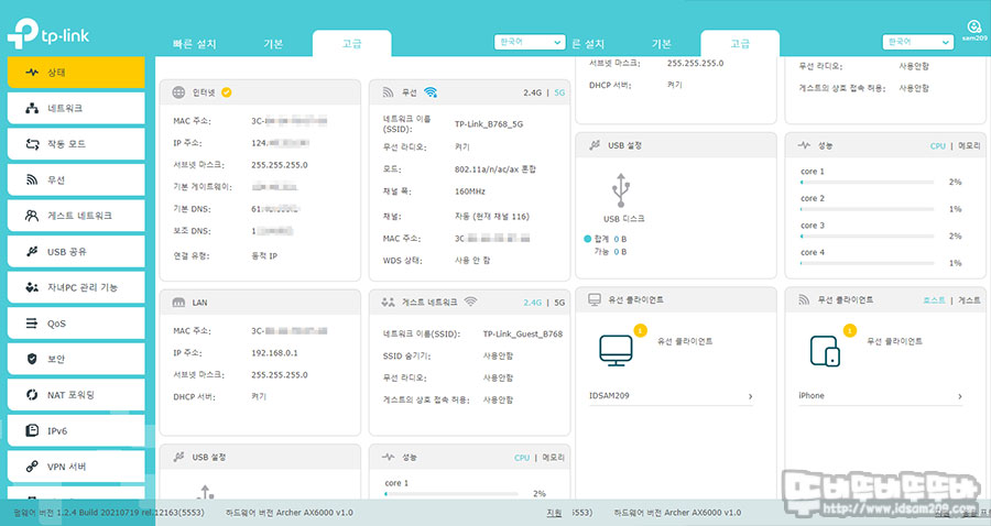 이처럼 티피링크 Archer AX6000 관리자 메뉴 UI는 초보자가 보더라도 부담 없는 간편한 메뉴 구성되어있어 부담이 덜한 편이니, 제품 구입 후 천천히 메뉴 구성을 살펴보시기 바랍니다.