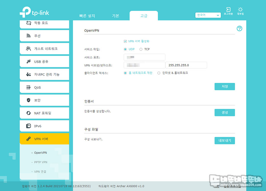 웹 브라우저를 통한 관리자 메뉴 접속 시 빠른 설치 메뉴보다는 기본/고급 메뉴로 보시는 게 편하고요.