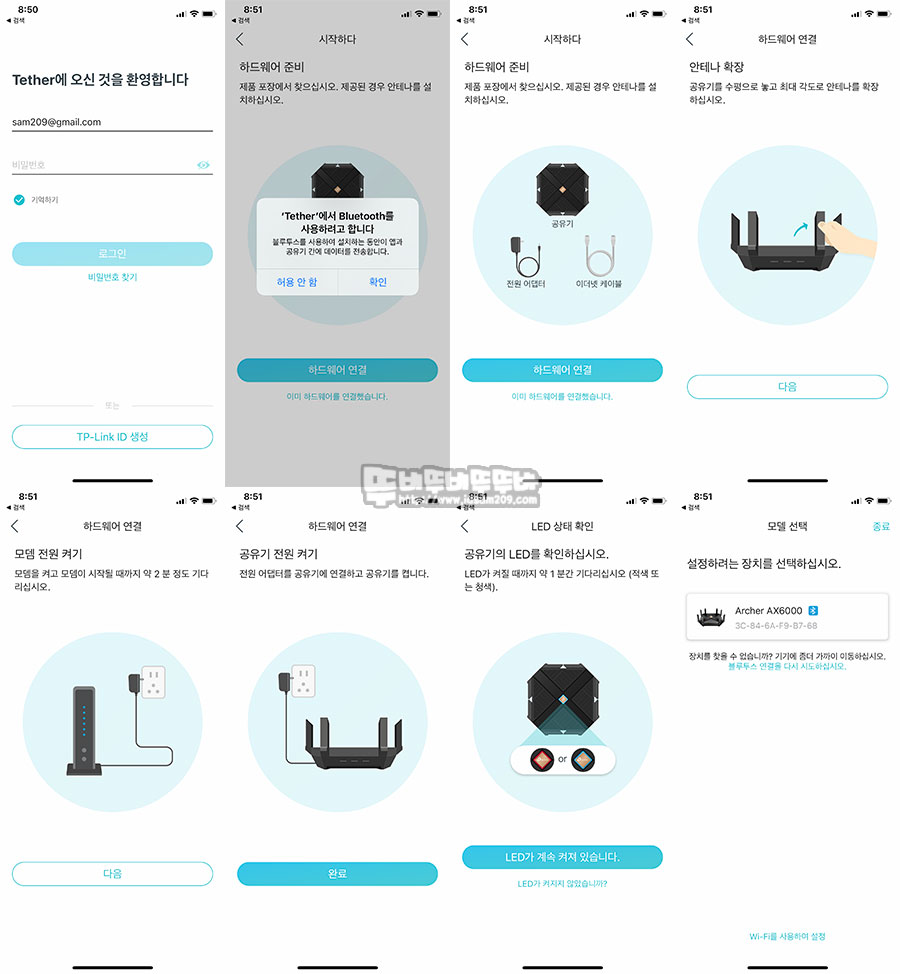 블루투스 연결로 사용하게 되는 Tether 앱을 실행하면 친절하게 설정 과정을 안내하고 있어 초보자도 손쉽게 화면의 내용을 따라 설정할 수 있으며 모든 설정이 끝나고 Archer AX6000이 블루투스로 연결되면 관리자 비밀번호를 입력하거나 Tether 앱을 통해 티피링크 계정을 생성 후 사용되게 됩니다.